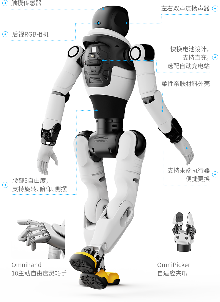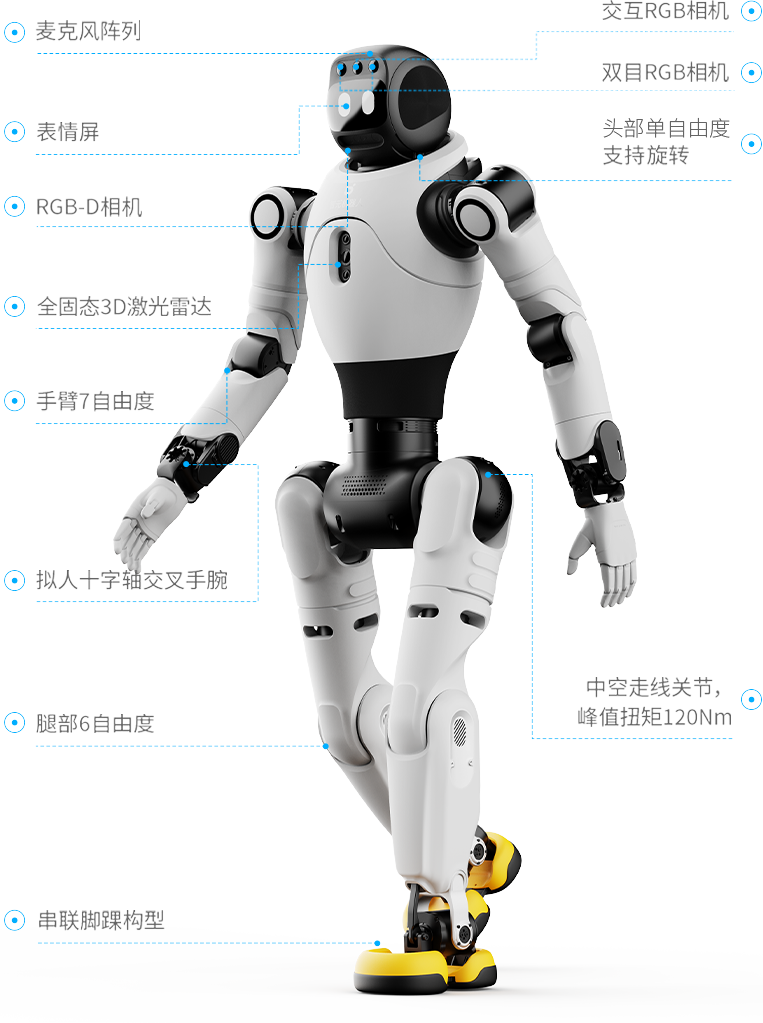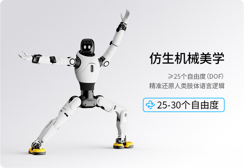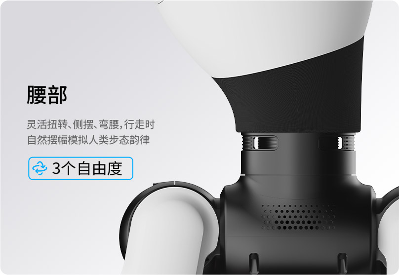 亲和 拟人交互视觉交互、语音交互、触觉交互、表情交互可结合用户手势、场景信息、上下文语境,进行智能互动让每一次互动交流充满温度灵动 生命体征拟人步态、复杂舞蹈、头随声动25-30个身体自由度,包含1个头部自由度、3个腰部自由度,动作灵活多变、生动有趣智能 自主任务自主导航行走、主动避障、自动补能基于算法自主决策,不依赖遥控操作,运行更智能高自由度仿生躯体让每一次互动交流充满温度产品参数